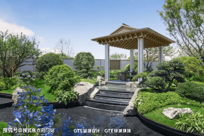 大门两侧辉映的玉石围栏、居中的铜质大门、雅致的穹顶,以及门前两株精心修剪的罗汉松,营造出一份非凡的尊贵与雅致。入口水景以九孔涌泉带来财聚福满的祝愿,中央雕塑以“舟”为灵感,用现代手法打造中式美感。四水归堂以四方水景呼应建筑的形制,浸润着归家的过渡空间。
