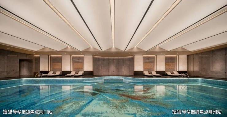 下沉式庭院的侧边,就是恒温泳池,大面通铺落地玻璃,一边游泳,一边看巨石飞瀑,很有味道,而且这个恒温泳池,还是做了成人与小孩区分的异形泳池,这非常非常少见。