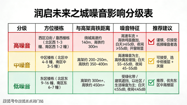 根据楼幢距离模型测算,我也大致整理了一份噪音影响的选房攻略,仅供参考,当然这个只是理论值。