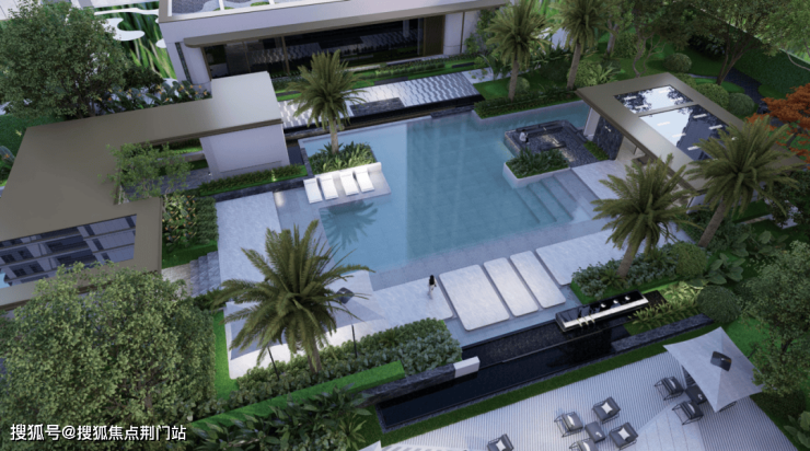 与摩登水院相连的是 定制级热带景观泳池,援引度假酒店设计理念,泳池旁选种6棵“热带贵族”加拿利海枣树,并用肾蕨、大吴风草等热带植物加以渲染,一年四季流转出不同的风景,打造出独特的热带风情。