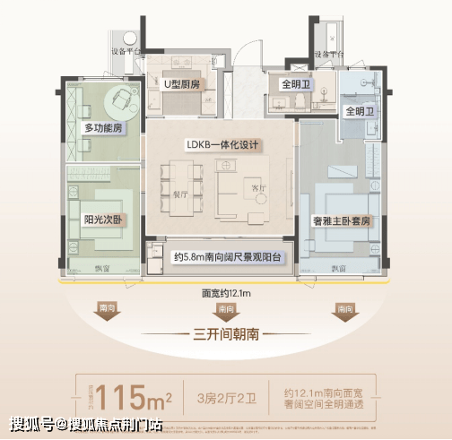 约115方户型:三开间朝南+LDKB一体化边厅设计,打破空间局促感。约27㎡的餐客厅与5.8米观景阳台无缝串联,形成“社交—景观—生活”三重动线,配合12.1米南向面宽,实现“阳光平权”。