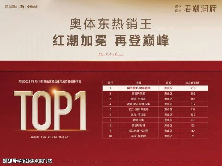 当市场寒意让多数人选择观望时,保亿国丰·君潮润府却持续霸榜7-11月萧山区商品住宅成交套数排行榜TOP1(数据来源于克尔瑞),这份“硬核业绩”佐证了市场对“好房子”的渴望从未消散。