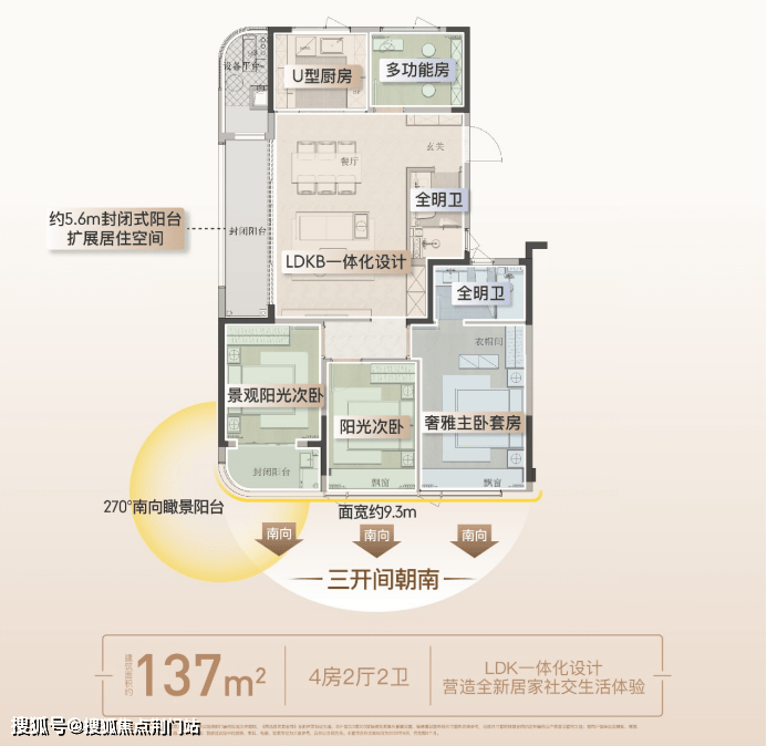 约137方户型:约5.6米大面宽竖厅联动双阳台,享约9.3米南向观景面。南向三卧全朝南布局,南向次卧采用270°转角窗,晨起推窗即见688亩玉湖的晨曦与飞鸟。