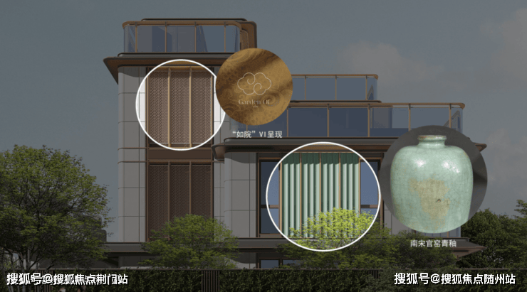 又如立面的呈现,如果说玻璃与铝板的结合诠释了现代建筑的轻盈时尚,那么陶板与石材的点缀,则为建筑注入了东方古韵,再加上如意云纹金镂格栅、寻杖勾栏、避风䈋等宋代元素的创新转译,更增添了建筑的文化韵味。