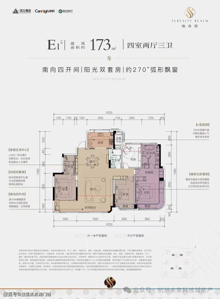 :约123㎡三房两卫起,173㎡终极改善户型,匹配精英家庭生活场景。