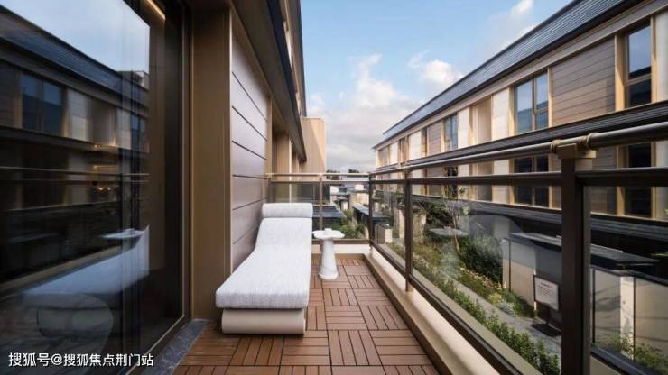 排屋立面采用金属瓦、仿木纹铝板、古铜色铝板和沉香米黄石材等多种高级材质搭配,历久弥新。其中伊朗红洞石的运用堪称点睛之笔,临安人一眼就能看出,该石材色泽与临安“国宝”鸡血石十分相近,越秀对在地文化的致敬可见一斑。
