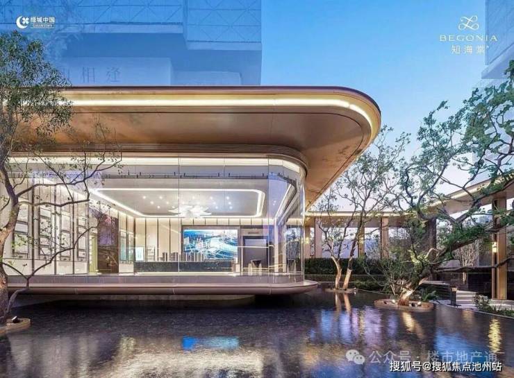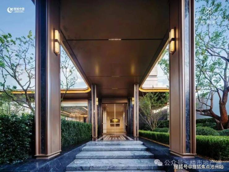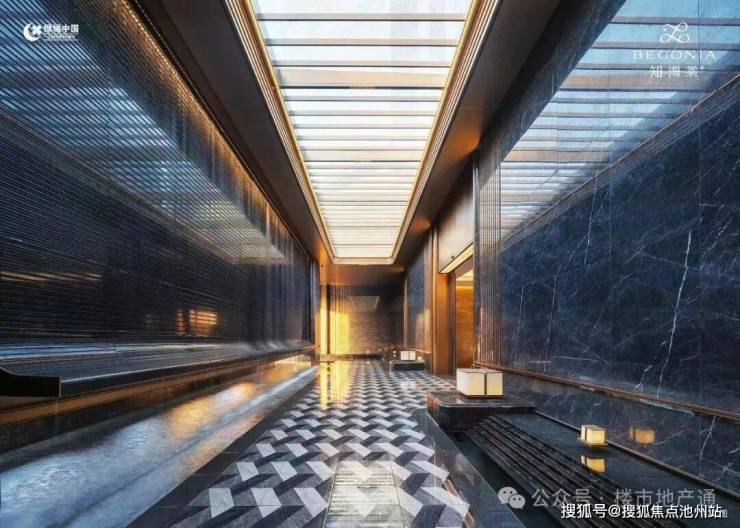 通过门廊,采用透光吊顶,通透感更强,来到归家大堂,落地玻璃外就是大片水系