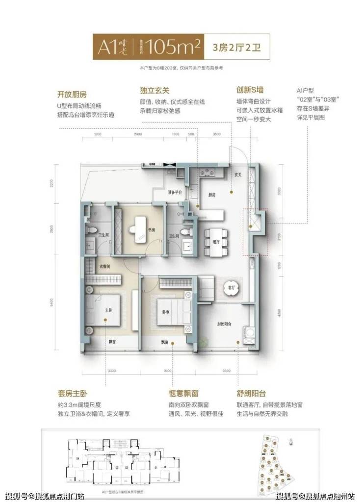 建面约105㎡晴光户型,不仅实现更优面积排布,更做到精神与审美的高度适配。在设计中,这间三房同样拥有南向大面宽,搭配S墙/开放式厨房/一体化餐客厅/多功能书房/酒店套房主卧等,将整个空间的开阔感和互动性做到极致,满足居住者对舒适、安逸的“精准需求”。