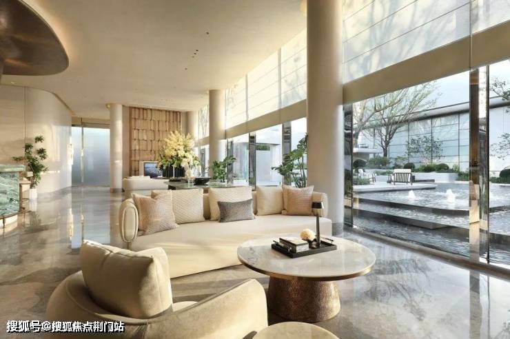 底层选用浅色调天然石材,巧妙融入圆弧设计元素,彰显出空间的优雅与品味。这种极致细腻的金丝画框设计,四边以高品质金属铝板环绕,搭配全景玻璃幕墙,既彰显通透之美,又体现现代风格。