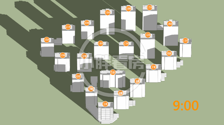 夏季:栋朝向正南采光优异。1#边户由于处于凹处位置,日照略有缺失。