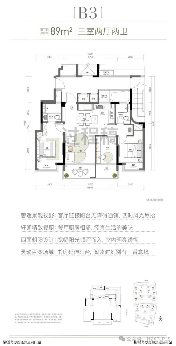 市场爆款建筑面积约89m²神户型,四开间朝南、约11.5米南向面宽、约18.5m²豪华主卧,三室两厅两卫格局,91%高得房率,舒适度堪比100方空间。
