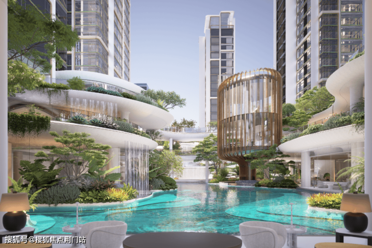 作为未科核心首个全抬板社区,元序通过五重景观环岛,将园区整体抬升约5米,2楼相当于普通住宅4楼,架空层最高达约6.3米。得益于此,业主可穿梭于三层立体式景观水院,超2500㎡景观水系之中,层叠错落间,仿佛行走于“悬浮于城上空的绿洲”;