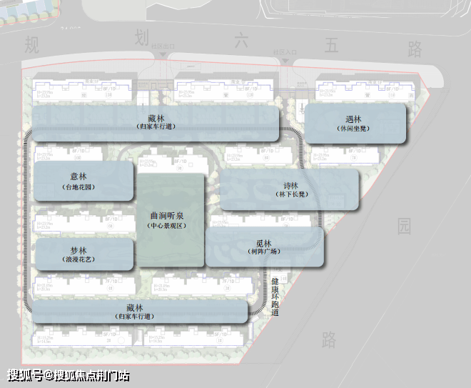 十庭:中庭景观会客厅(风漾碧浪) 、口袋花园(五感花园) 、儿童活动场地(童梦流萤) 、景观会客厅(树影烁光) 、洋房庭院(倚风园) 、南侧组团花园(乐丘漫步) 、高层花园(泛云园、翠微园、寻幽园 、卧月园)