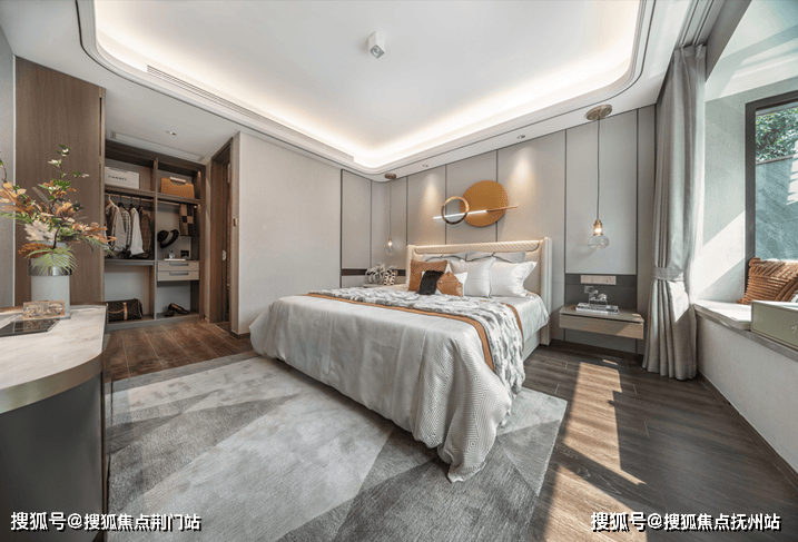 在中骏金辉·未来云城客厅及卧室,梁志天经典造型—三层叠级弧形吊顶装饰天花板,优雅勾勒出高阶生活场域。这项工艺繁复且造价高,耗时为普通吊顶的3倍,常被应用于星级酒店中,足以体现未来云城之用心。