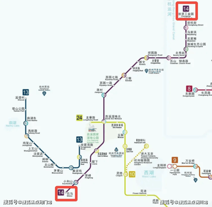 杭州地铁14号线分为南北两段,北段从崇贤开始,途经运河新城、西溪湿地。南段从小和山开始,一直到富阳西站,全程60多公里,沿途与地铁2、3、5、10、19号线均可换乘。