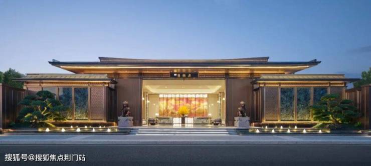 两侧景墙精选深邃蓝翡翠奢石,一对铜狮威严镇守,造型苍劲的迎客松旁是松下涌泉;门楣之上,雕饰着寓意“平步青云”的“云纹”,每一处细节,都在无声诉说着东方的归家礼序。