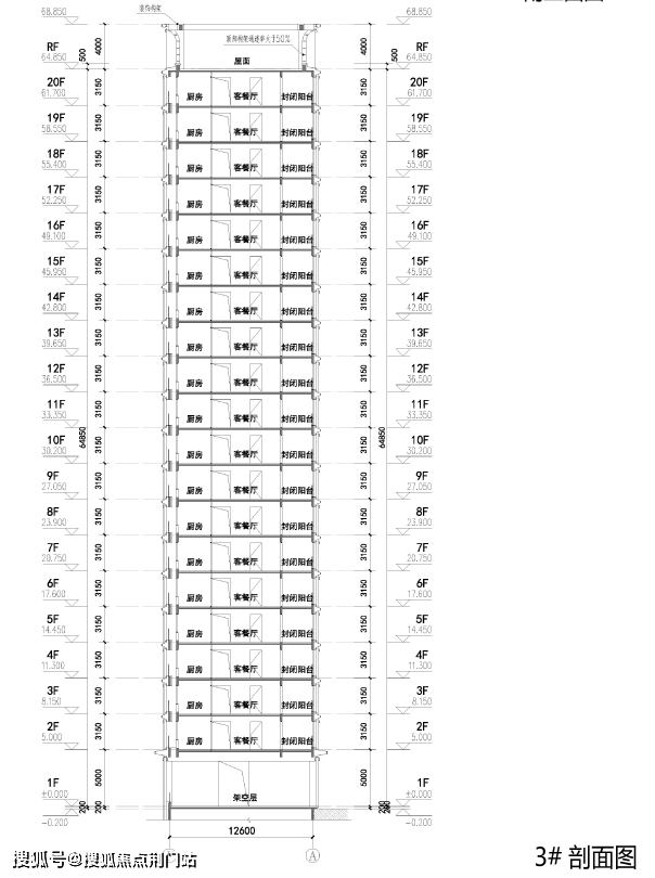 地块总用地面积27534m²,总建筑面积104955.05m²,其中地上建筑面积87670.76m²,地上计容建筑面积68835m²,地上不计容建筑面积18835.76m²,地下建筑面积17284.29m²,建筑密度22%,容积率2.50,绿地率35.01%。以3#剖面为例,住宅架空层层高5米,标准层层高3.15米。地块规划4幢4F、1幢15F、4幢16F及3幢20F共计12幢住宅。