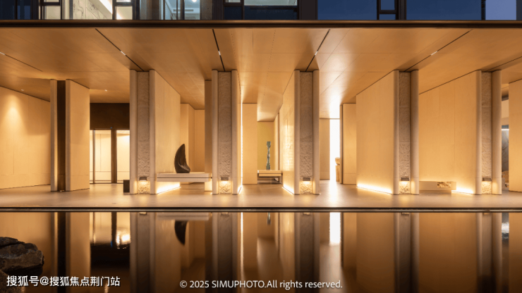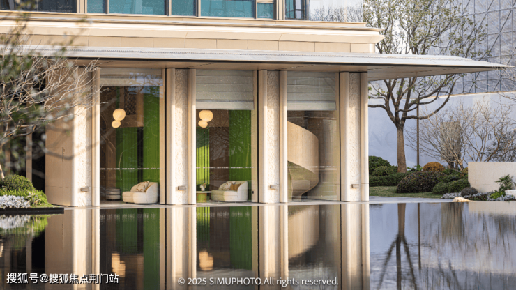 园区内精心规划了超过2200平方米的独特水景区域,让绝大多数楼幢享有推窗即可欣赏的优美水景。在这片宁静的水域之上,一座致敬艺术大师杉本博司的玻璃茶亭轻盈漂浮。其全透明的设计与周围的松林、茶丛、梅园相映成趣,共同构筑了一幅如梦如幻的画卷。人们称之为水上的“时空回廊”,仿佛漫步于水面之上,穿越历史的长河。