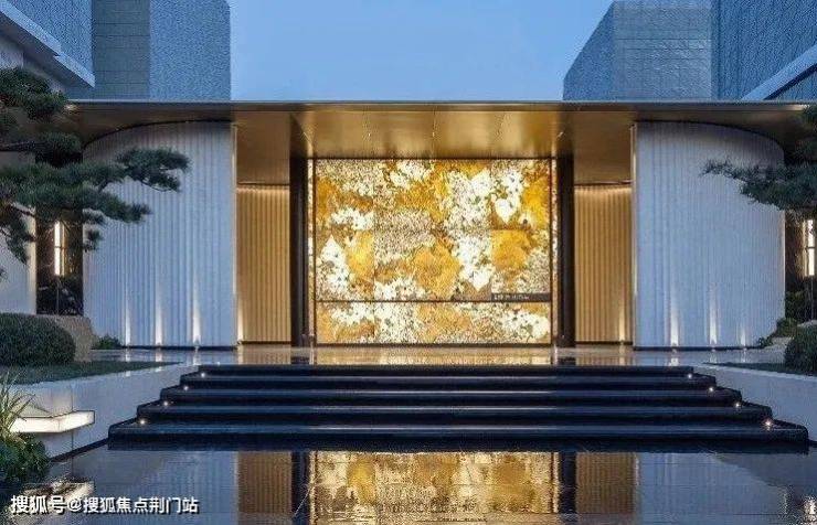 门头设计巧妙地将东方松画的意蕴与西方建筑的拱券立面相融汇,两侧挺立着四棵精选黑松,每棵价值高达数十万,彰显尊贵气息。中心照壁采用极致轻薄的大理石奢石镶嵌,柔和的暖光从中散发出温馨的氛围。两侧圆弧形的入户通道,既展现了西方简约风格,又蕴含了中国传统三进院落的内敛之美。