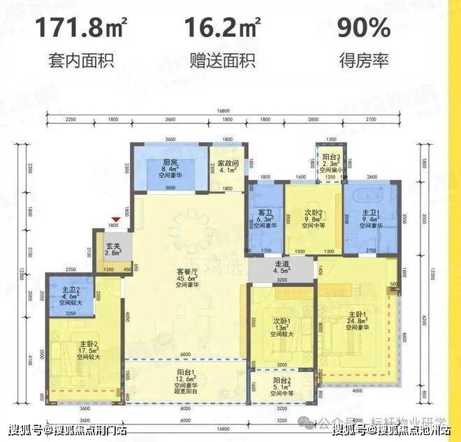 3)170方B1、B2南厅户型,4房2厅3卫,得房率88%