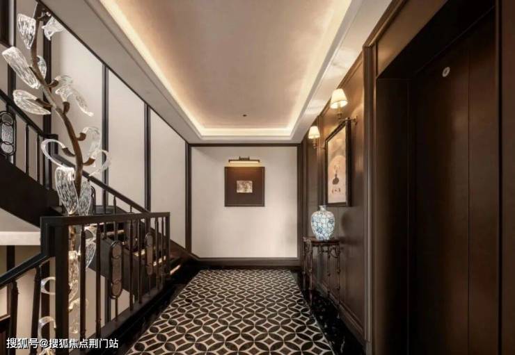 它还不止是宽,更有深度,走在这条缓坡而上的廊道上,是不一样的归家感受,两边列队欢迎的奢石,是「翠谷幽兰」,单方造价非常贵;顶上是三个玉石天井华盖,采用叠级的手法,有着宫廷的礼序。