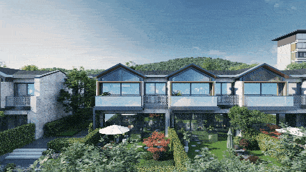 深灰色陶瓦屋面与森绿自然融为一体,散落湖山之间,私享怡然闲逸之境。