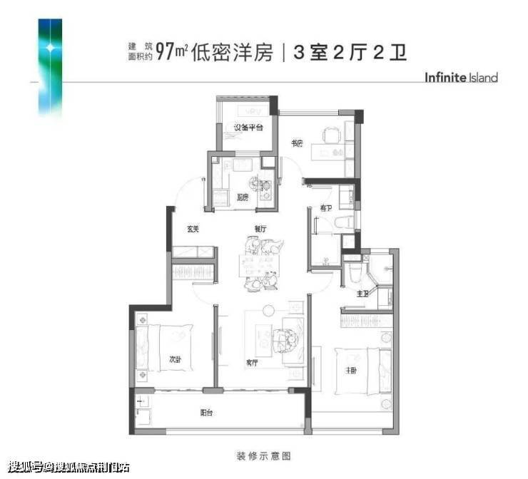 这么一来,户型的格局也就打开了。比如建面约97㎡三房两卫,就是三开间南的“三叶草”,室内无过道浪费,还带约6.4米宽景双阳台。
