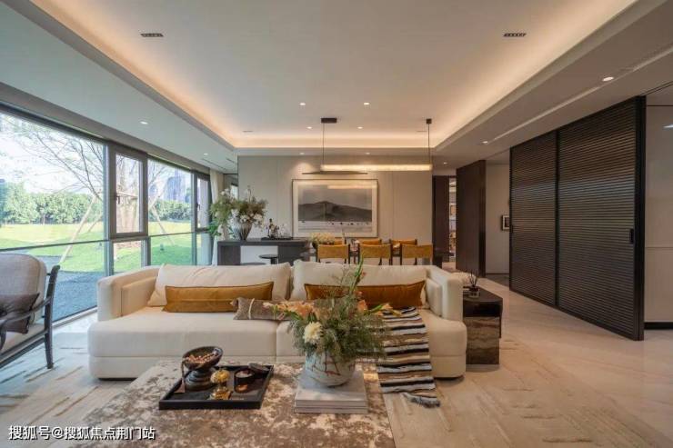 LDKG一体化设计,搭配大面落地玻璃,地面白金沙岩板通铺,吊顶是大通顶,双背景墙采用壁布硬包、帝王翡翠岩板,没有多余的结构墙体,以豪奢尺度构建出家庭交流的超级广域公区。