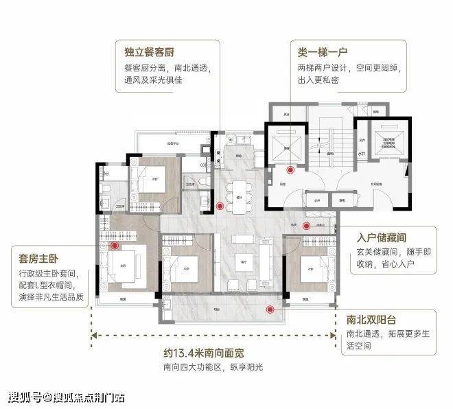 2T2户设计,带入户电梯厅。私享墅级入户体验约13.4m超大面宽采光,餐、客、厨一体化竖厅设计,更享三居室朝南。一孩家庭,兼顾父母与孩子惬意舒居;二孩家庭,阳光平权,俯瞰园林景观,同享自然风光。
