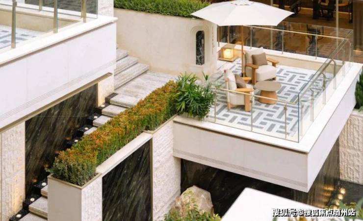 归家动线以环绕下沉式庭院布置。漫步在连廊之上,以水为引再铺陈精选的绿植,随手一拍,松弛气场油然而生。