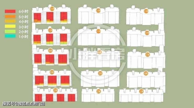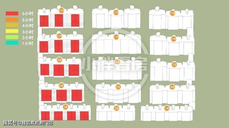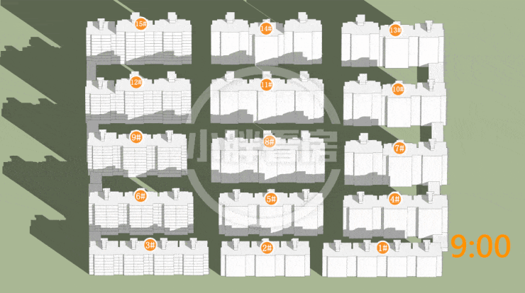 冬季:3#采光优异几乎不存在遮挡。6#9#12#15#低层受遮挡。具体遮挡时间而言,6#9#12#15#全天不同时段均会受到遮挡。