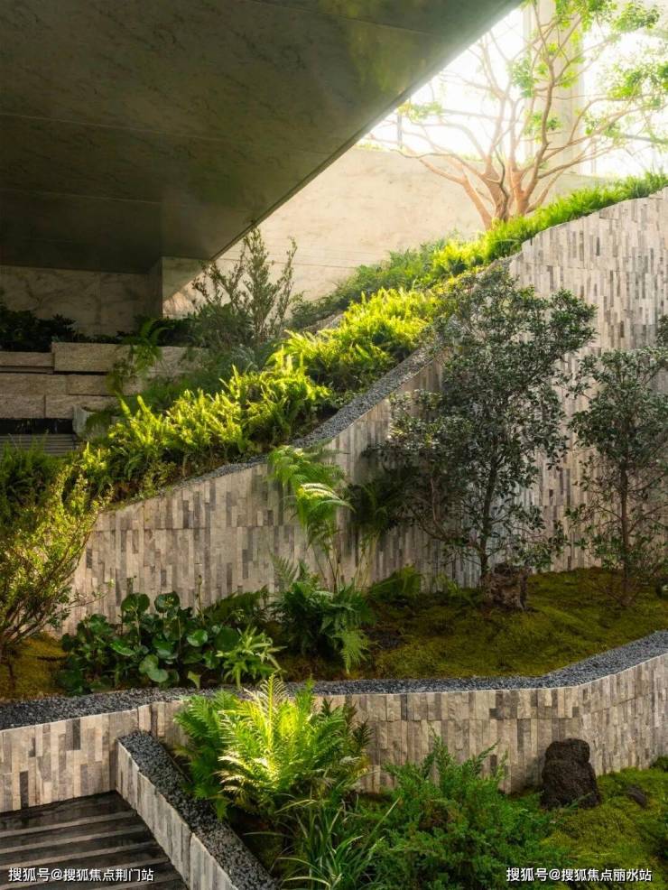 在这个立体悬浮世界里,有着天台层、归家层和下沉庭院层的垂直景观布局。从穿长廊的登高望远、到见溪潭、叠流韵的曲水流觞,再到揽河景、探幽境的探幽寻密。