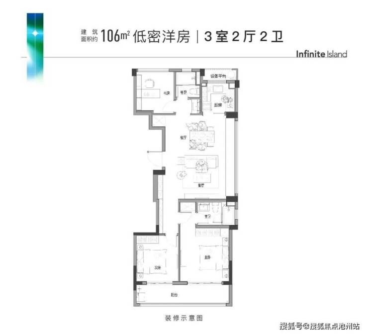 建面约106㎡边套户型,带约6米长的飘窗大边厅+约6.6米的宽景双阳台,满满的“越级改善感”。