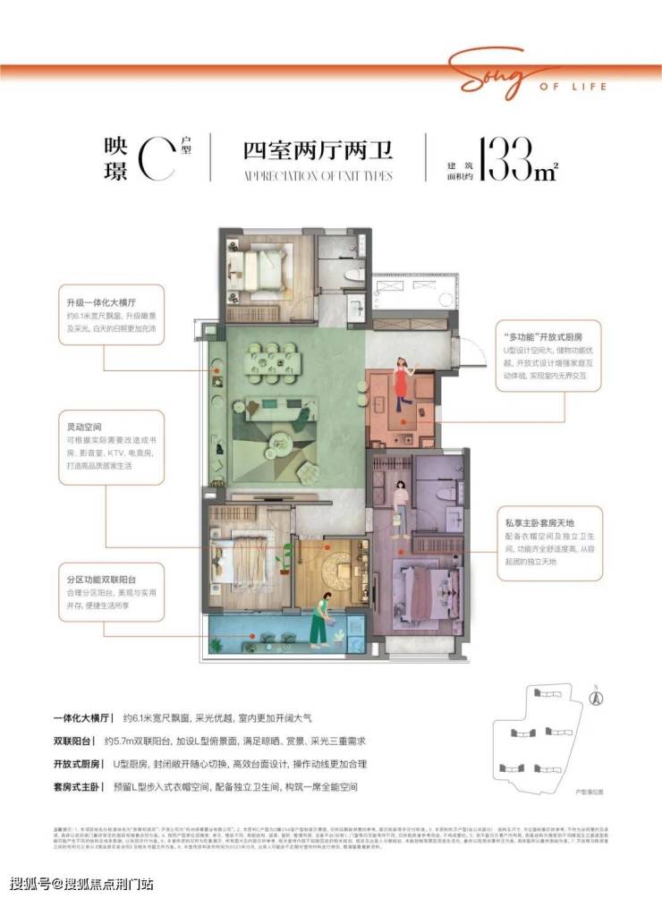 约106㎡户型点评:双联阳台约6.7米面宽,加设L型俯景面,满足晾晒、赏景、采光三重需求,LDKB一体化设计,打破各功能区域的隔离,整个空间更加开阔,开放式厨房 U型厨房,封闭敞开随心切换,高效台面设计,操作动线更加合理