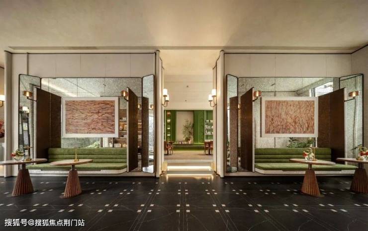 瑰丽元素,成为贯穿全局的风格标识,同款的通高玻璃格栅、泥客石荔枝面墙壁、云石壁灯,以及黑白棕三色石材的几何拼花地板,穿越时空遥相呼应。