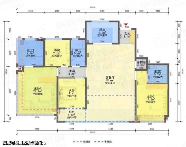 3.独立电梯厅+玄关+家政间+储物间+南向生活阳台+三卫配置,功能无死角