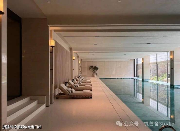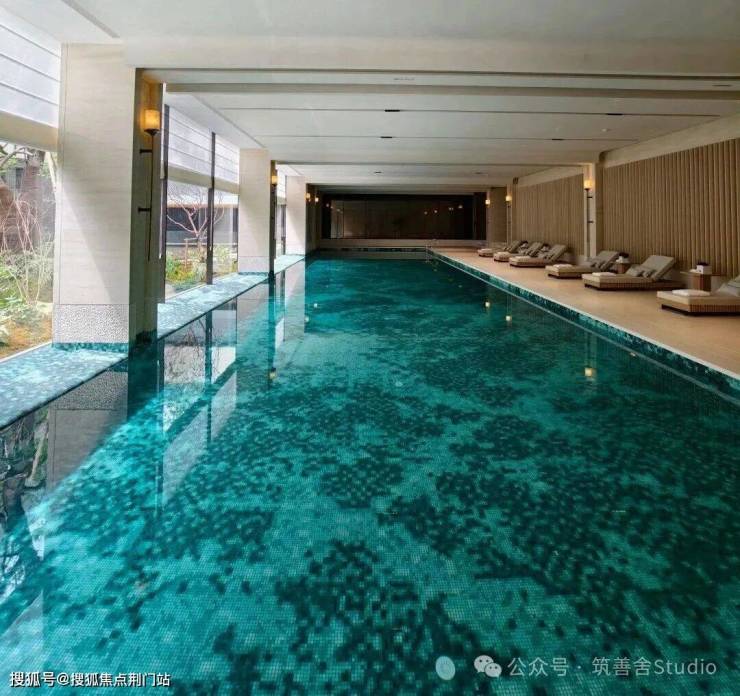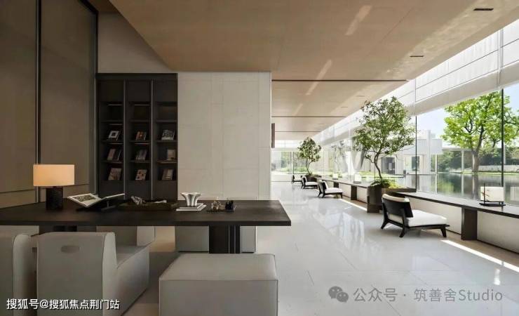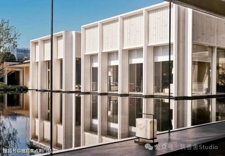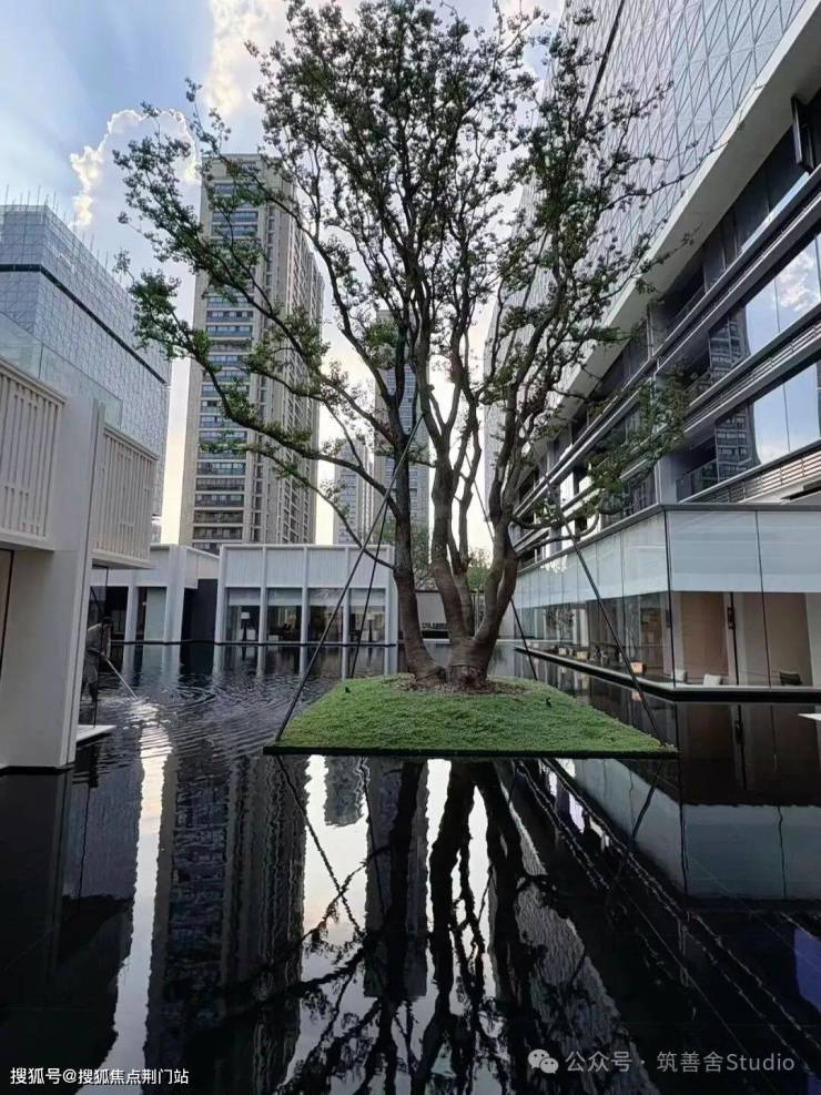 园林设计上则更偏酒店化,以希腊安缦卓熠为灵感,整个核心区园区以约900方的无界中央水景为主体。穿过大门后,约900㎡的无边界水景豁然眼前,建筑、回廊与树丛仿佛凌波而立。正如“美人在骨不在皮”,无需繁复修饰,大尺度空间、开阔水院与大面积玻璃自成画布,任自然光挥洒,这才是内蕴的性感。最是没的是在11号楼架空层的邻里中心——窗沿与水院浑然一体,桌案几乎与水面持平,微风拂过,涟漪便从眼前漾开。庭院里的丛生乌桕,不事雕琢,保留原生枝条的疏朗与错落,尽显自然之美。