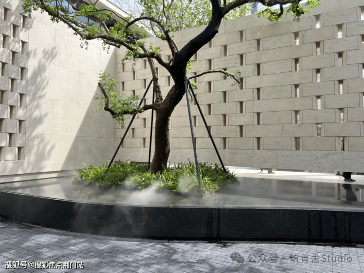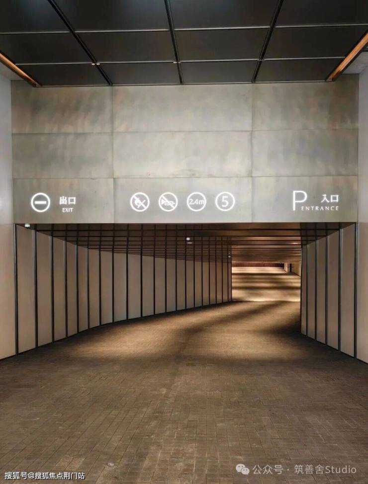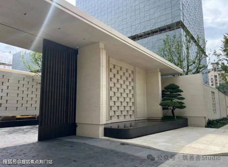约36米长的主入口,与这其他项目流行的巍峨豪阔、金碧辉煌已截然不同,黑白原石的碰撞,没有五颜六色的炫石,主打一个高级黑白灰,从社区主入口便能领略这份高级感。它并未将大门设在主干道,而是巧妙地选择在西侧次路,营造出一种归隐都市的谧静氛围。以维纳多石材为主体的双门设计,左侧是人行入口,右侧为车行入口,秩序井然,人行车行各司其侧,搭配古朴铜门,尽显宏伟与艺术格调。太行金老石皮打造的景墙,借框景手法呈现流水山石的空灵意境。