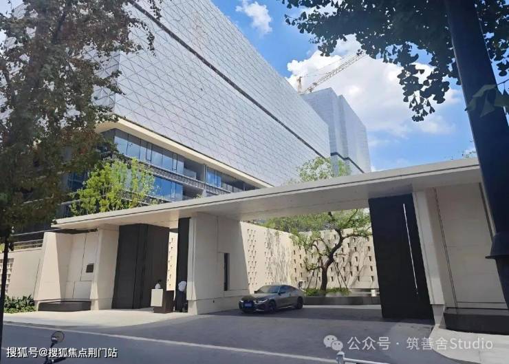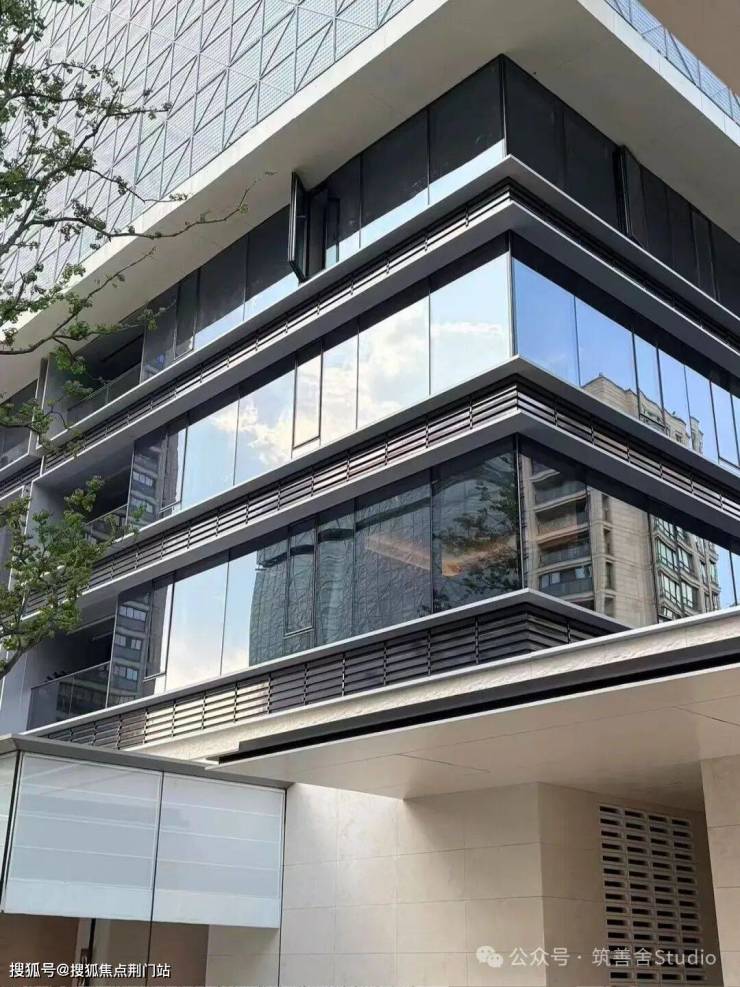 安璞的建筑立面,同样以其卓越的审美理念惊艳亮相,高层外立面以中式对称美学为基底,横向延展的铝材线条与大面积玻璃,赋予楼宇轻盈飘逸的视觉感受,实则坚固稳固,彰显空间容量而非体积感。南立面尤为惊艳,石材的厚重、玻璃的通透、均釉陶砖的温润,三种材质刚柔并济,在0.618黄金比例的精准统摄下,交织出极具艺术张力的奢华气韵。铝板、陶砖与石材的精妙结合,不仅保留了现代线条的轻盈,更通过陶材的温润光泽和石材的沉稳质感,营造出富有层次的艺术魅力。