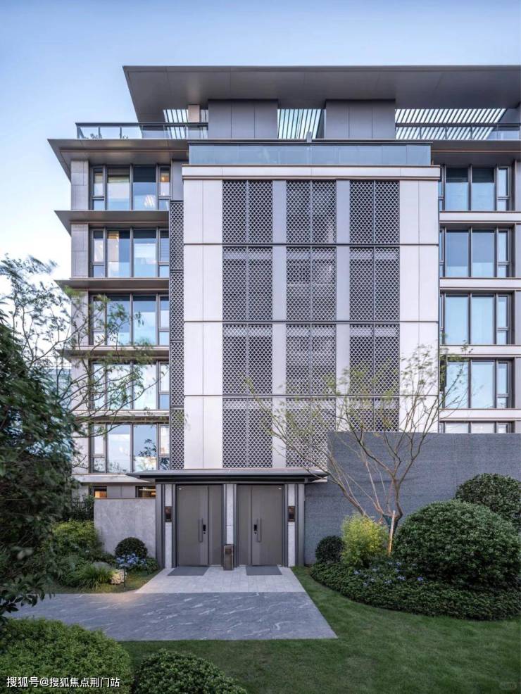 建筑外立面以玻璃幕墙与香槟金铝板勾勒流线型轮廓,主入口采用“普拉达绿”奢石铺陈,配以罗汉松造景,营造隐奢归家礼序。约1500㎡下沉式会所「雲隐馆」内嵌恒温泳池、健身房及咖啡吧,以柏坡黄石材与黑松、羽毛枫打造宋韵山水庭院,成为临平高端社交主场。