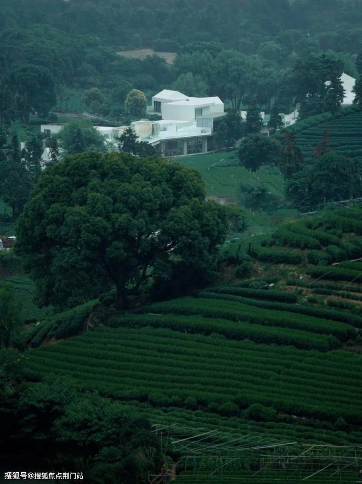 大坡顶+小坡顶结合,与台地呼应。再将茶山的脉络线条镶嵌在屋檐上,屋面采用瓦片材质与金属钩边铺装,青瓦交叠,蕴藉着江南诗意。