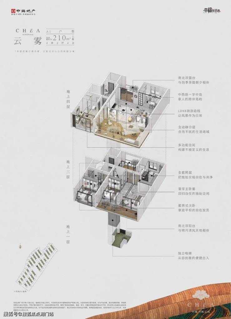 例如起步建面约210方上叠户型-云雾,上下都配备专属电梯私家入户,上叠行政级主卧+两间大尺度次卧,均是套房设计,做到了真正的全屋套房平权,主卧更是在南北做到了双面花园景观入室。