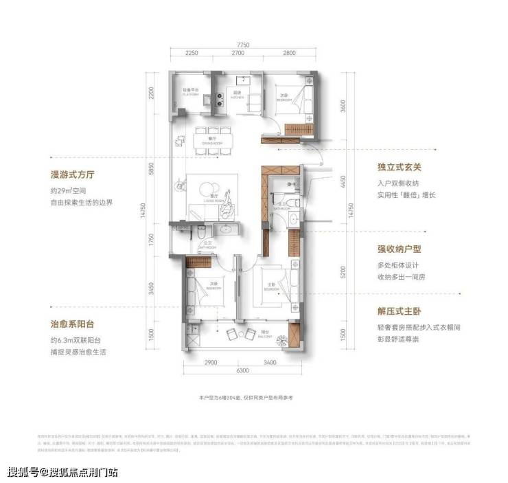 约110方的边厅户型入户玄关收纳空间拉满,可以放鞋,挂伞等,实用性倍增; 大边厅带一个长长的飘窗,使得整个房子三面采光,明亮感翻倍; 两房朝南,还带了 跑道式阳台,约6.3米的开间,可以实现多种功能;厨房方方正正,烟道在北面的设备平台上,安放双开门冰箱,还能拥有足够的操作台面。