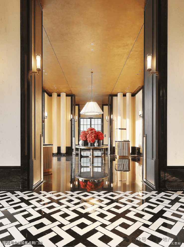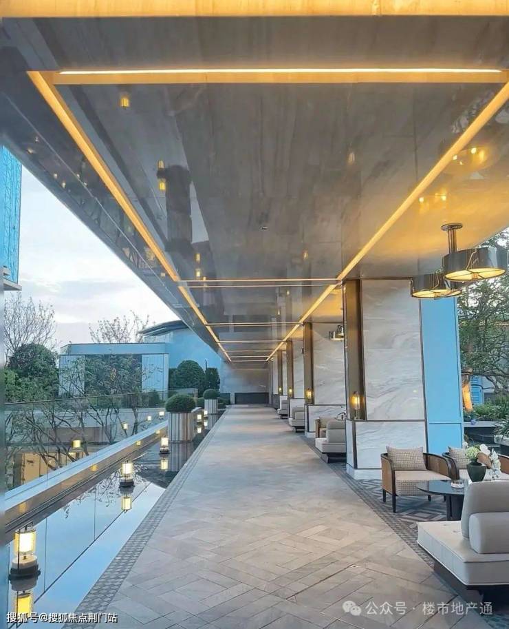 入户序厅向里走是双水景矩阵,内含4颗香橼树和聚宝盆雕塑;下沉庭院向下看是大面积水景元素、中心花园
