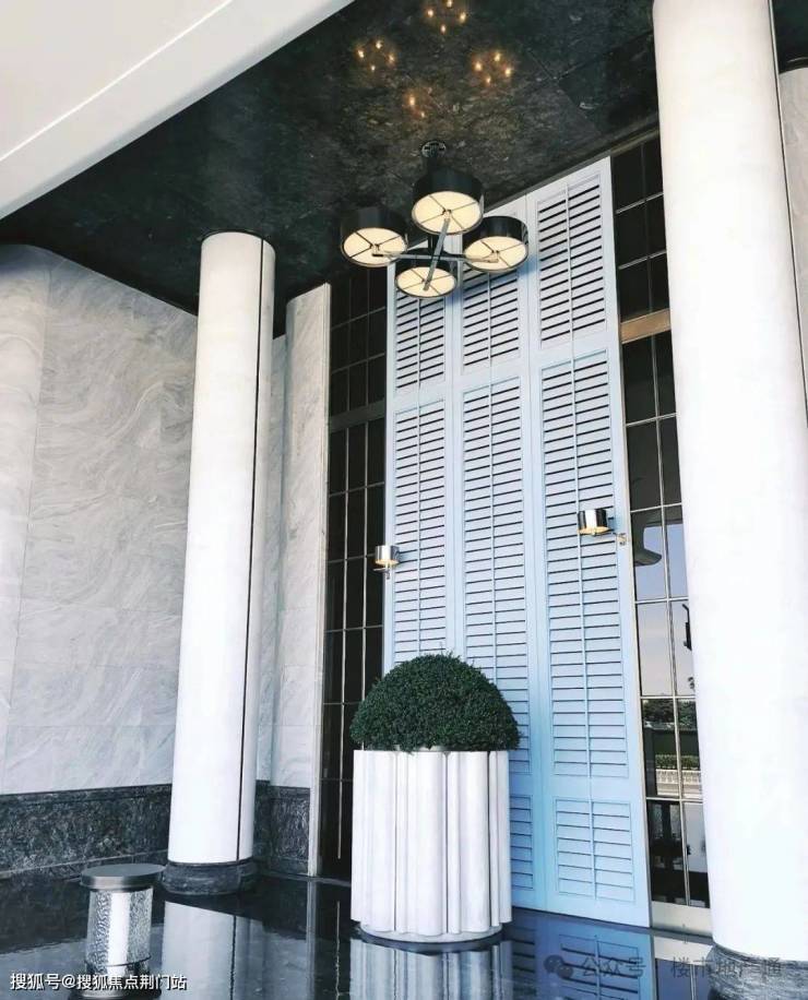 入户主体建筑以大面积宝格丽蓝为主色调,搭配深色铂金钻奢石腰线,卡里冰玉方柱和圆柱,柱屋顶双层黑白雨棚,湖蓝色的百叶格栅门