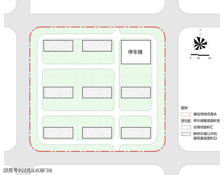 独立设置的且专门用于停车的停车楼宜设置屋顶绿化,所属建设用地范围内绿地率计算公式为绿地总面积与停车楼以外的建设用地总面积的比率,建筑密度计算公式为除停车楼以外的建筑基底总面积与建设用地总面积的比率。