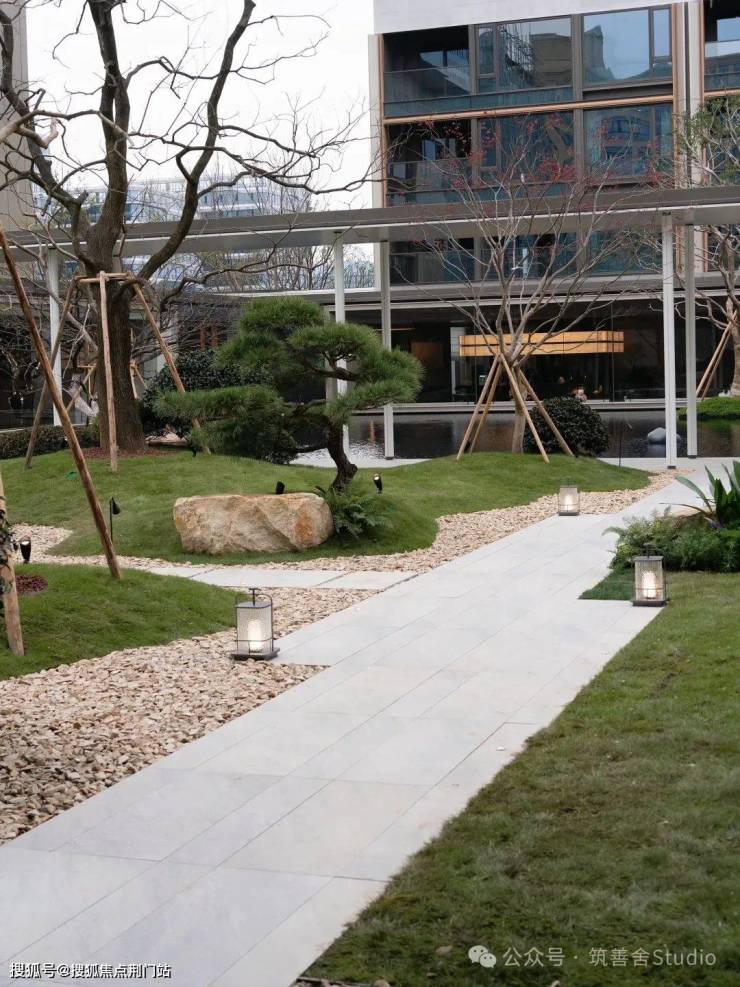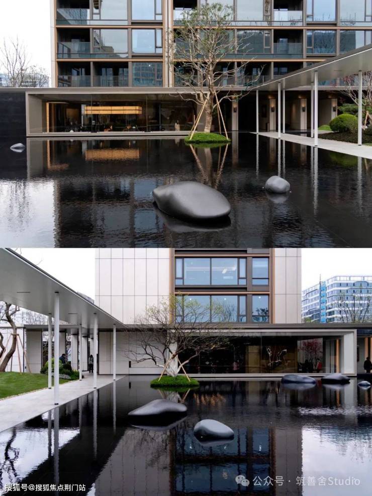 【小区大门】沐新月门头较之前的两个项目作了焕新升级,更显沉稳大气。入门瞬间,目光所及,尽是错落有致、对称排列的悬浮树阵,美感与秩序并存,令人忍不住踏入其中一探究竟。独具匠心的「水上树阵」,其下是一座如镜的水院,清澈见底,映照着天光云影,营造出树影漂浮于空中的奇幻意境。这「漂浮树阵」,与别具一格的门头相得益彰,一步踏入,即刻感受与世隔绝的优雅气质。