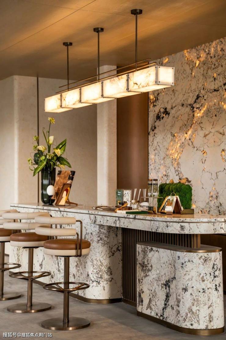 前场预留酒店环岛落客区,对标「鱼跃飞鹭」的水景雕塑矗立,基座采用乌克兰进口幻影蓝石材,镶嵌蓝色结晶,如梦似幻。