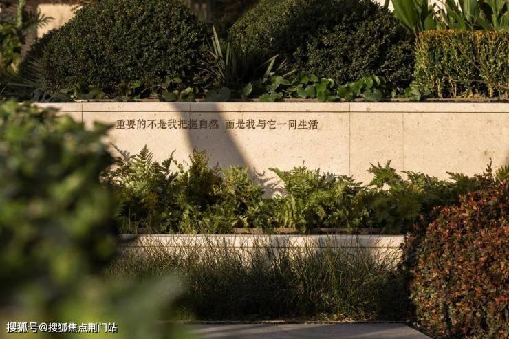 两侧景墙主体采用克罗地亚进口的贝金米黄石材,搭配造价不菲的孔雀开屏奢石,景墙两侧还精心种植了两棵铁冬青,奢华与贵气扑面而来。