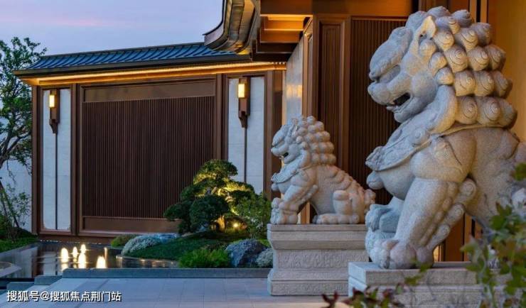 比如这一次的“建发式”大门一如既往,南北地块做了双大门设计,门头宽度达到约61米(含景墙)。入户做足了仪式感:重檐悬山式门楼、芝麻黑石材地雕、“鱼跃龙门”御道,两侧伫立着石狮、影壁、跌水、绿岛......还有两株精挑细选寓意“财富与健康”的罗汉松。